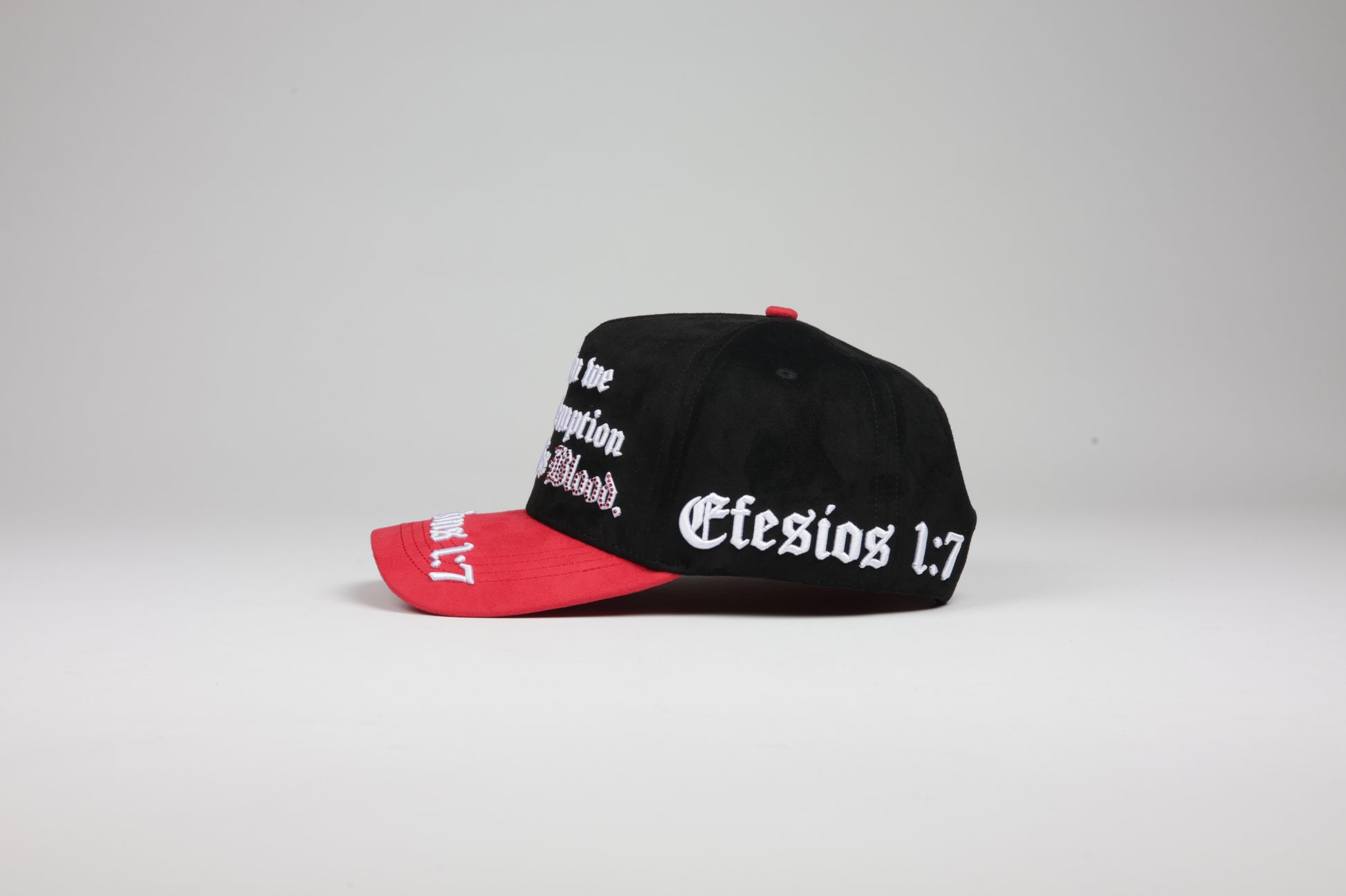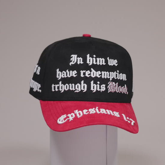 Efesios 1:7 habla sobre redención y gracia. Esta gorra simboliza ese acto de amor profundo a través del contraste rojo/negro: la sangre que redime y la oscuridad de la cual fuimos rescatados.